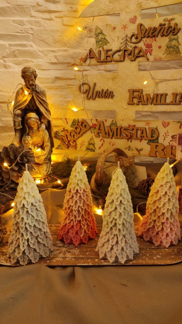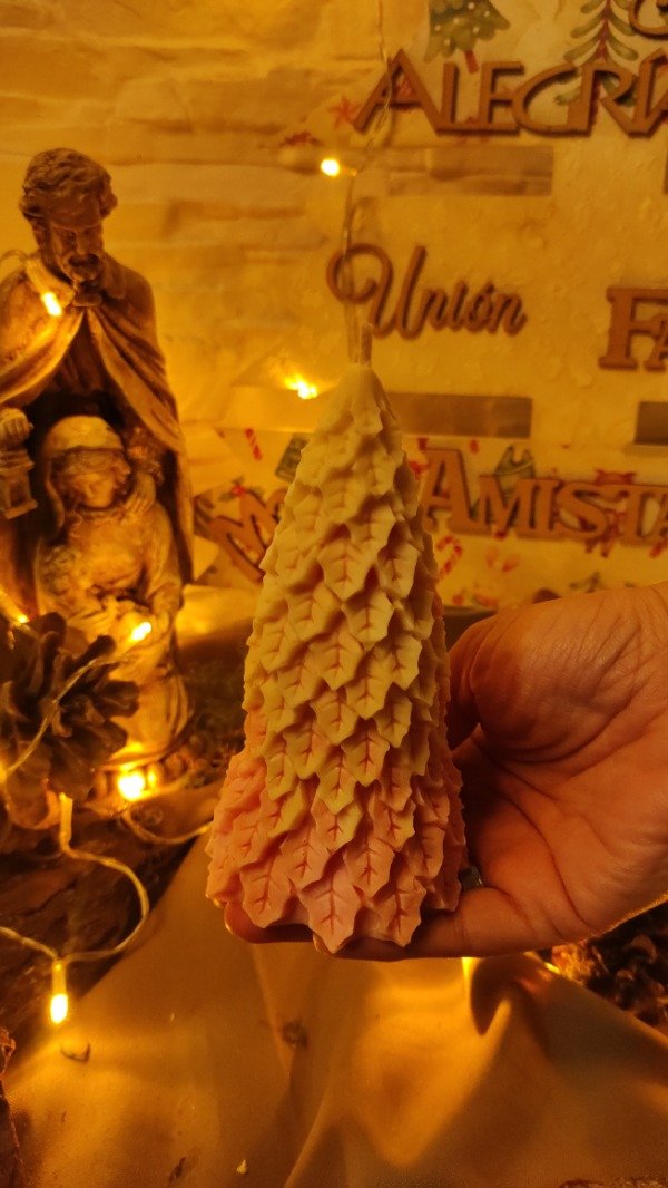 Vela aromática de cera de soja con forma de árbol con hojas.